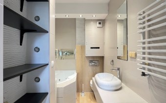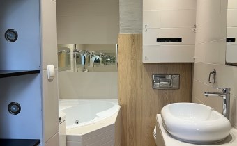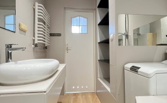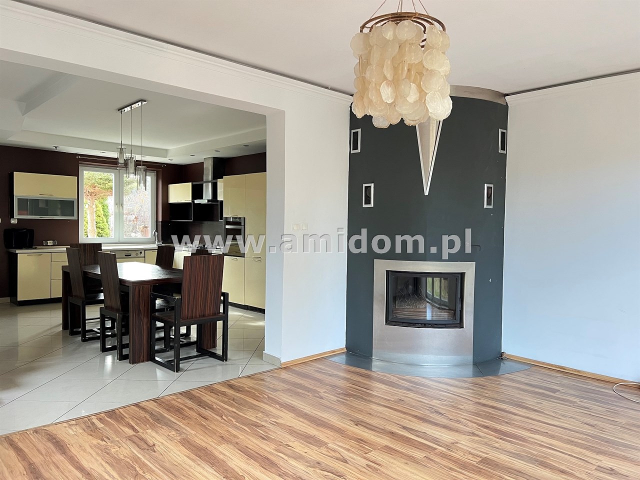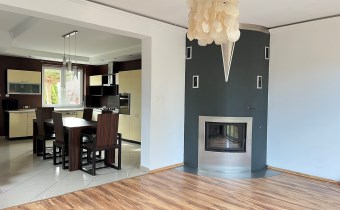 Na parterze w systemie otwartym (ok.44m2) znajduje się: salon połączony z widną kuchnią i jadalnią oraz wc z oknem. W salonie kominek z rozprowadzeniem ciepła na pokoje na piętrze i poddaszu.